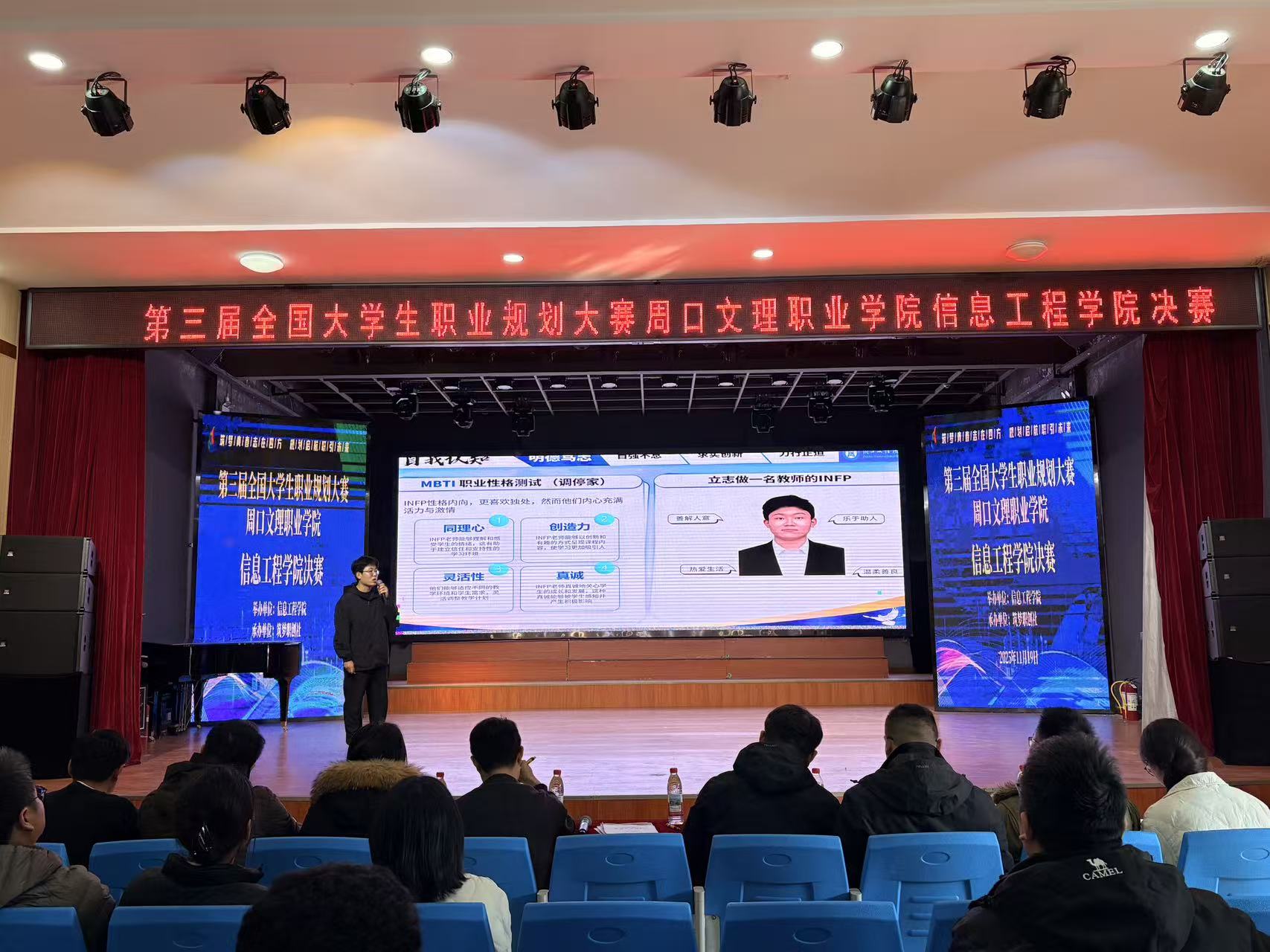 2025年11月19日下午三点,周口文理职业学院信息工程学院在学院报告厅隆重举行了第三届全国大学生职业规划大赛院级决赛。本次大赛以“青春筑梦 职引未来”为主题,旨在引导学生树立正确的职业观、成才观与就业观,提升职业规划能力与综合素养。信息工程学院党支部书记、院长何元飞,校招生就业科张婷婷老师、张一东老师、学工主任刘童心,综合办主任李书涵,教研室主任王新平,团总支书记张振,学工副主任赵濡铭等领导及专兼职辅导员出席并担任评委。